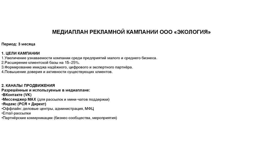 МЕДИАПЛАН РЕКЛАМНОЙ КАМПАНИИ ООО «ЭКОЛОГИЯ»Период: 3 месяца