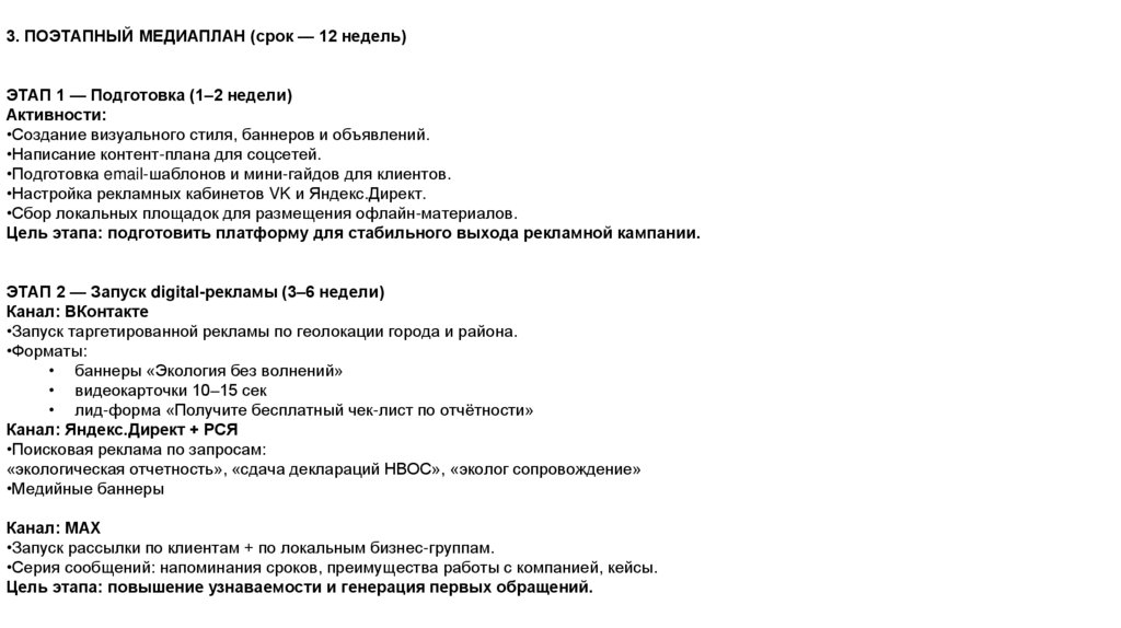 3. ПОЭТАПНЫЙ МЕДИАПЛАН (срок — 12 недель)ЭТАП 1 — Подготовка (1–2 недели)