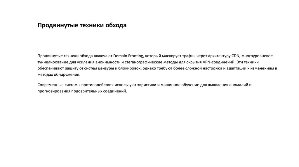 Продвинутые техники обходаПродвинутые техники обхода включают Domain Fronting, который маскирует трафик через архитектуру CDN, многоуровневое