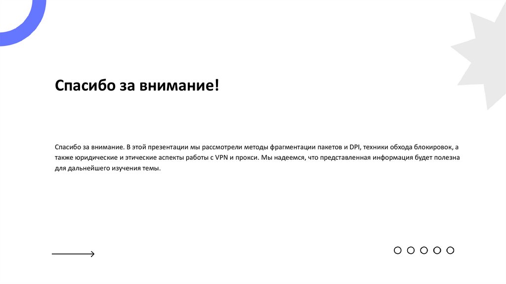 Спасибо за внимание!Спасибо за внимание. В этой презентации мы рассмотрели методы фрагментации пакетов и DPI, техники обхода блокировок, а