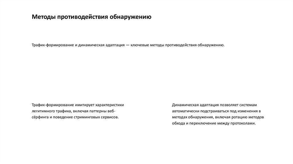 Методы противодействия обнаружениюТрафик-формирование и динамическая адаптация — ключевые методы противодействия обнаружению.