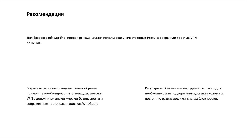 РекомендацииДля базового обхода блокировок рекомендуется использовать качественные Proxy-серверы или простые VPNрешения.