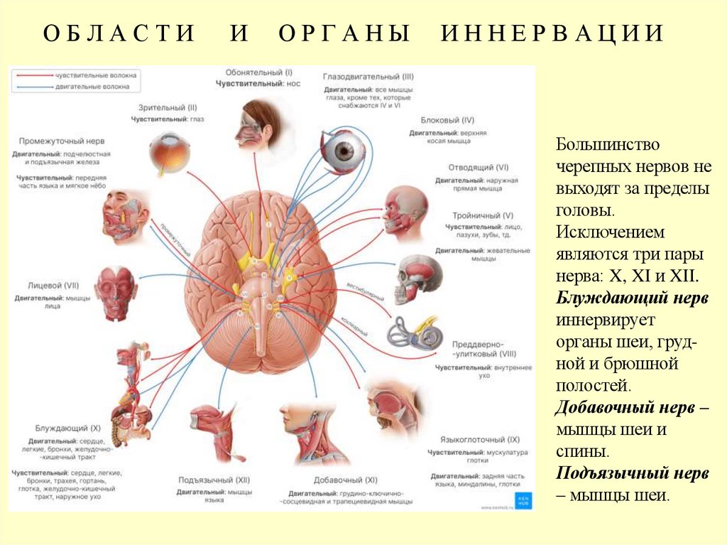 конечных ветвей для иннервации; следуют от рецепторов органов чувств,входят в череп через отверстия, входят