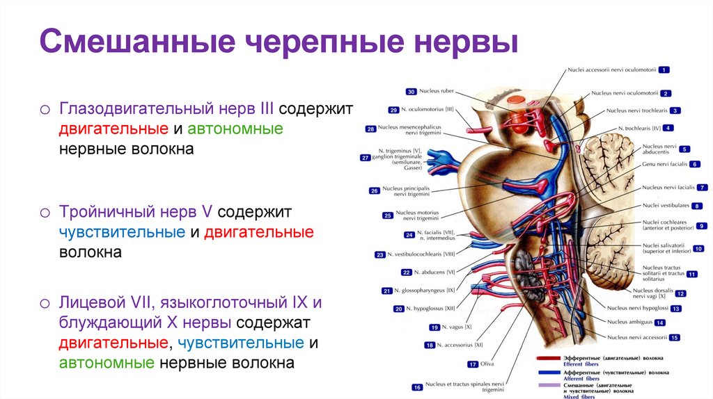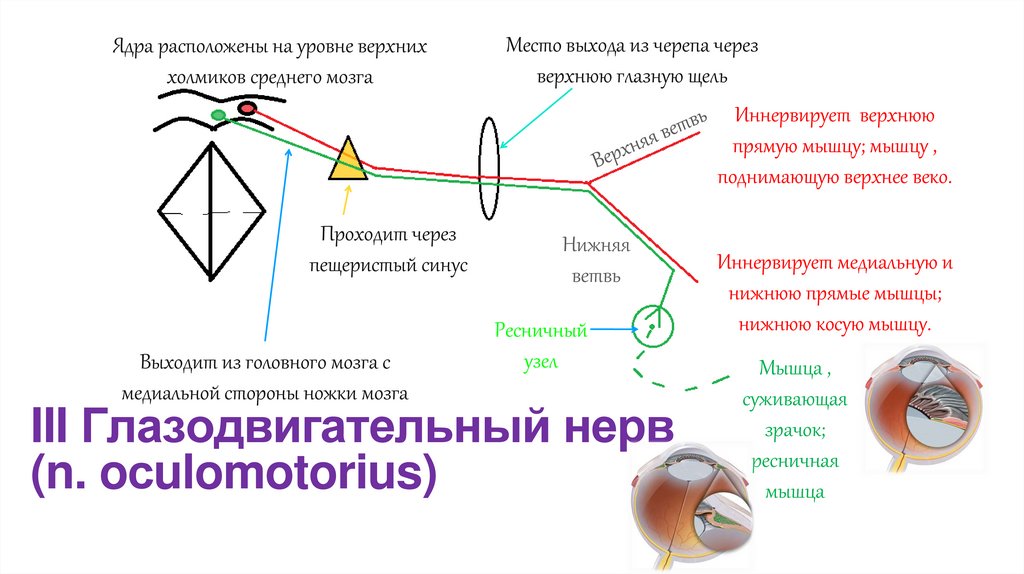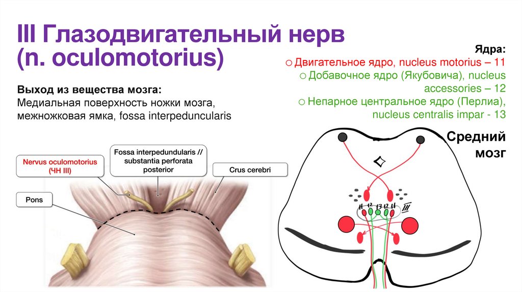 • Глазодвигательный нерв (III ЧН): состав волокон, источник формирования, положение