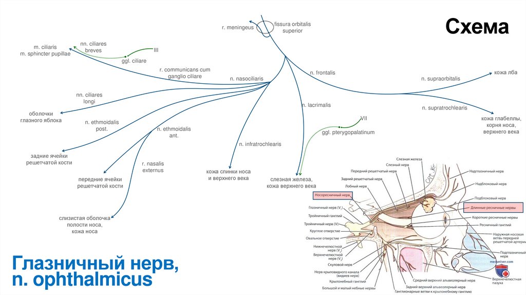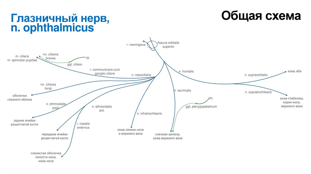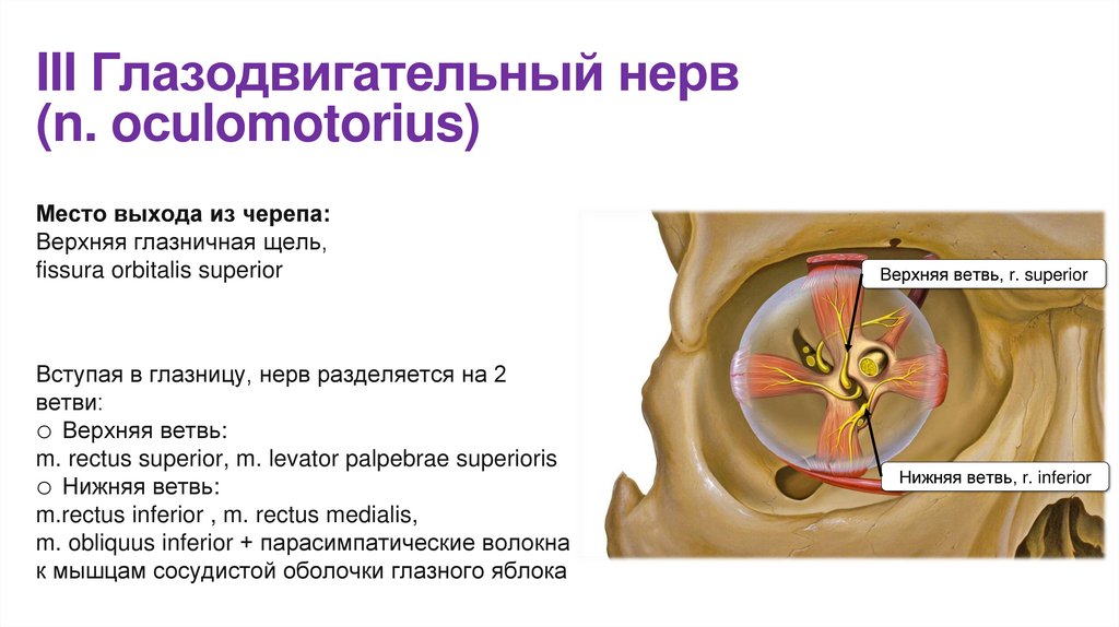 • Глазодвигательный [III], блоковый [IV] и отводящий нервы [VI]: состав