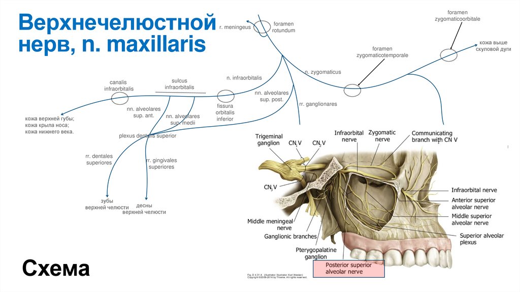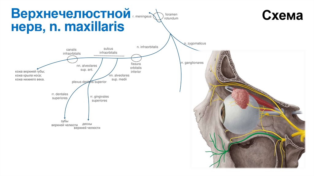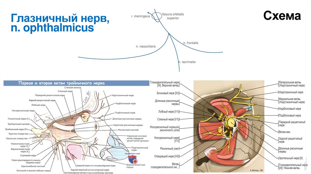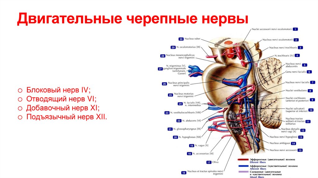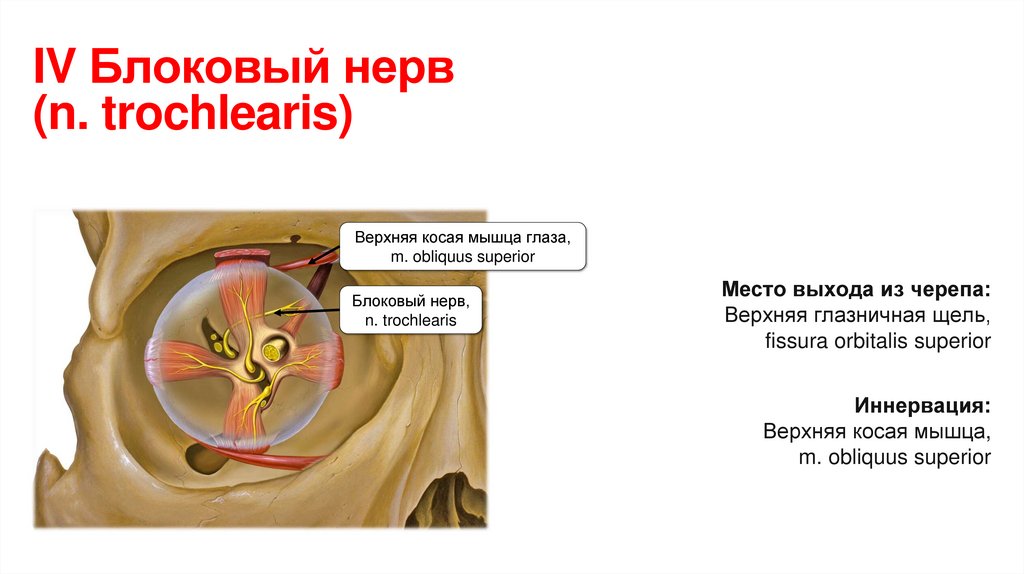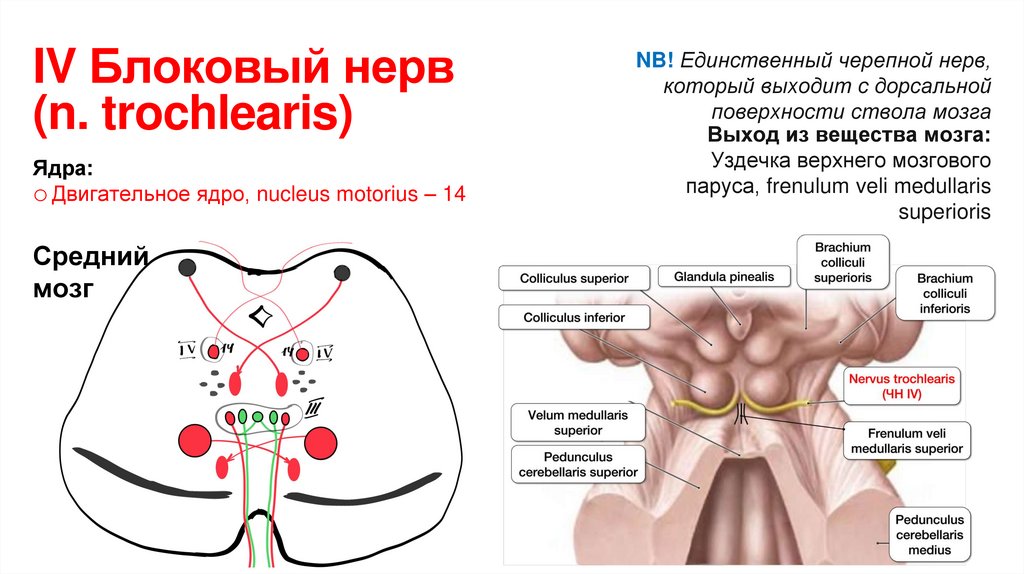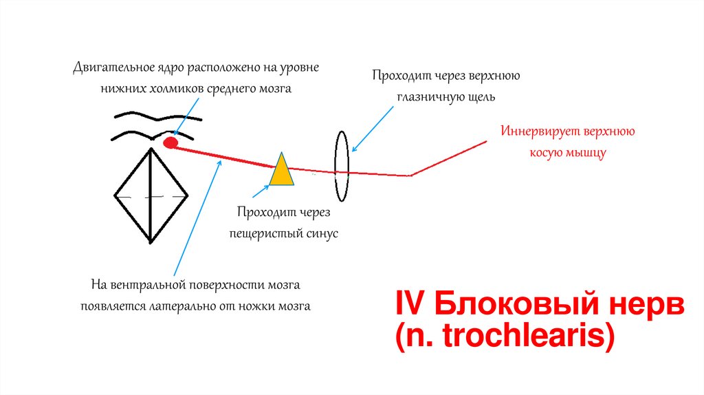 • Блоковый нерв (IV ЧН): состав волокон, источник формирования, положение на