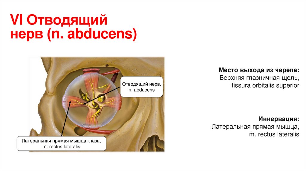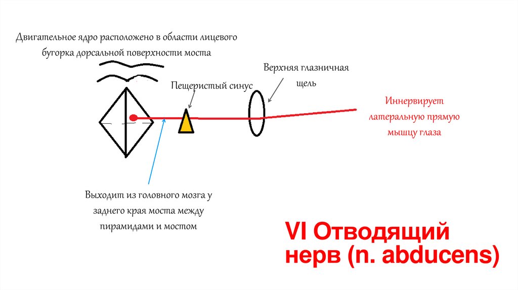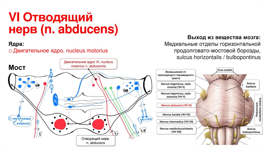 • Отводящий нерв (VI ЧН): состав волокон, источник формирования, положение на