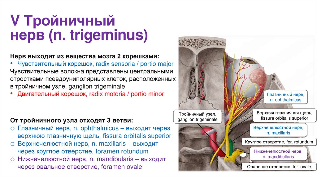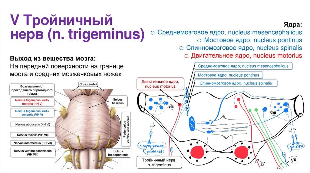 • Тройничный нерв [V]: состав волокон, источники их формирования, положение на