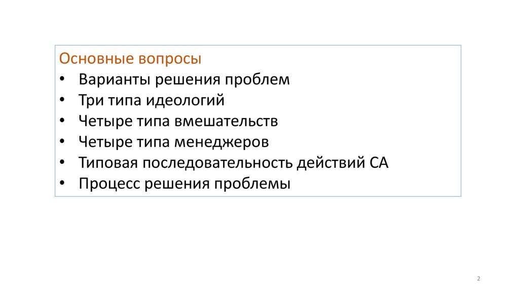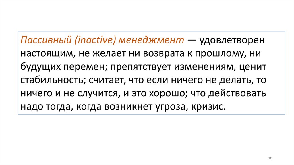 Пассивный (inactive) менеджмент — удовлетвореннастоящим, не желает ни возврата к прошлому, ни