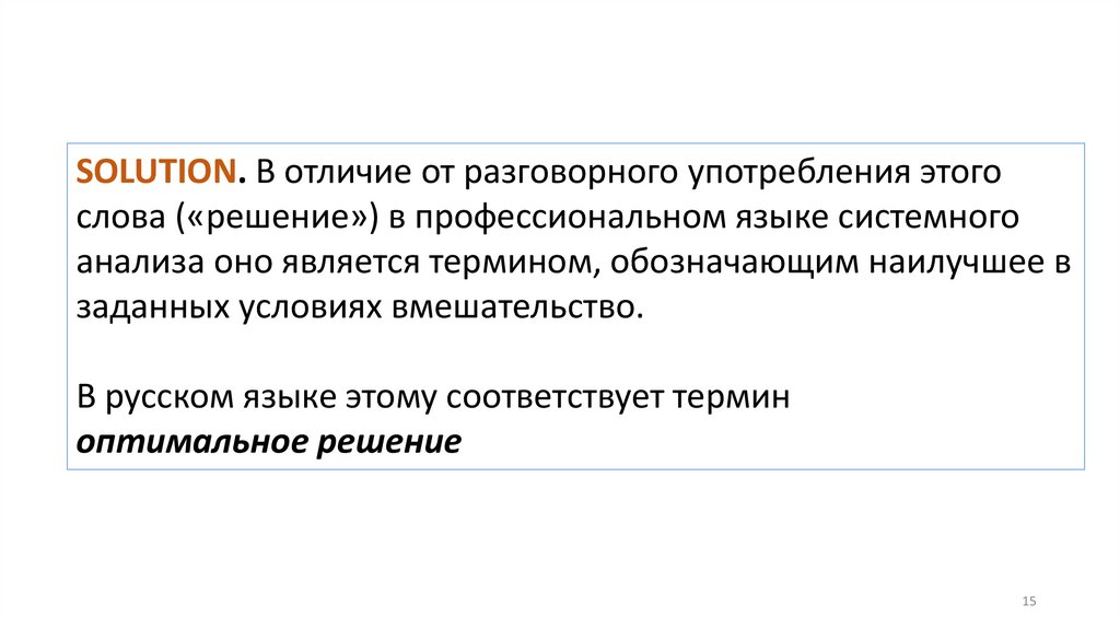 SOLUTION. В отличие от разговорного употребления этогослова («решение») в профессиональном языке системного
