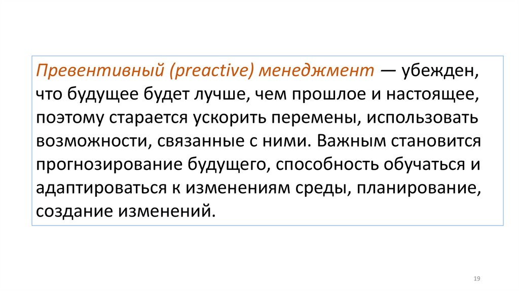 Превентивный (preactive) менеджмент — убежден,что будущее будет лучше, чем прошлое и настоящее,