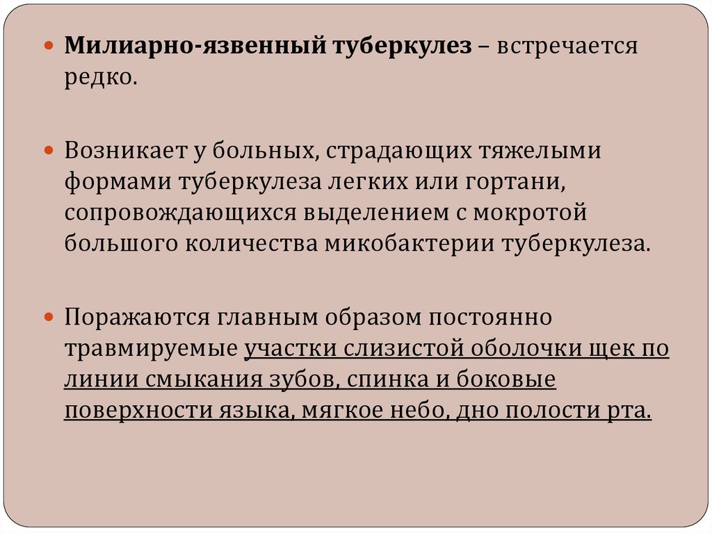 Милиарно-язвенный туберкулез – встречаетсяредко.