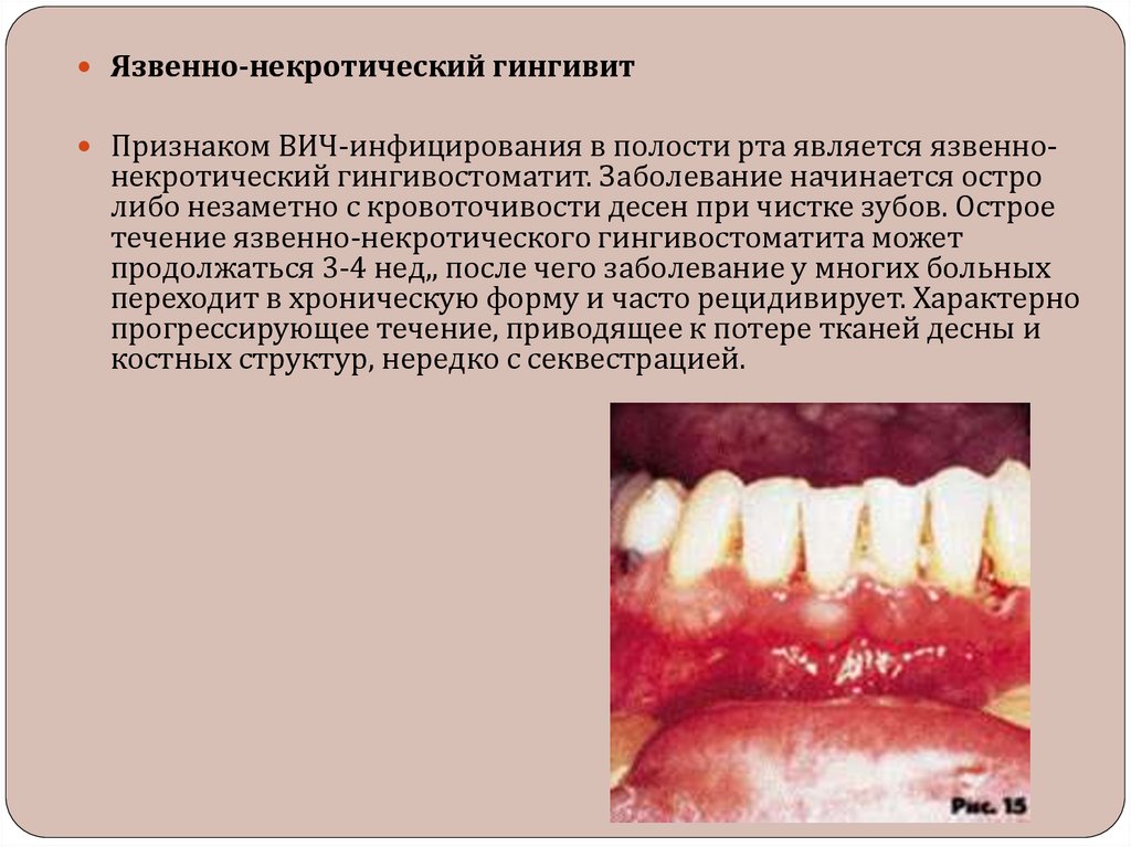 Язвенно-некротический гингивитПризнаком ВИЧ-инфицирования в полости рта является язвенно-