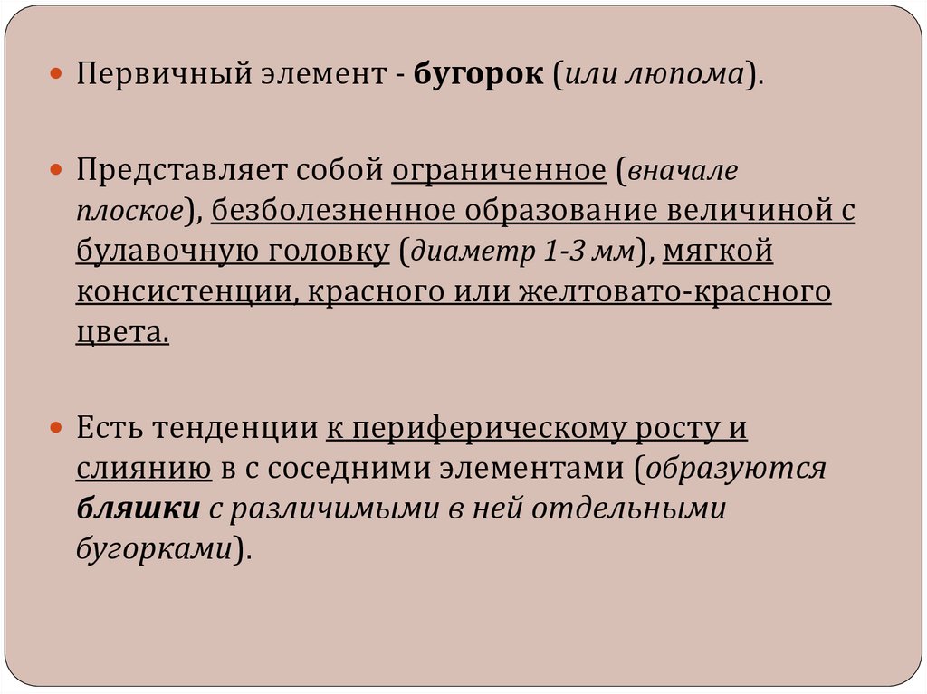 Первичный элемент - бугорок (или люпома).Представляет собой ограниченное (вначале