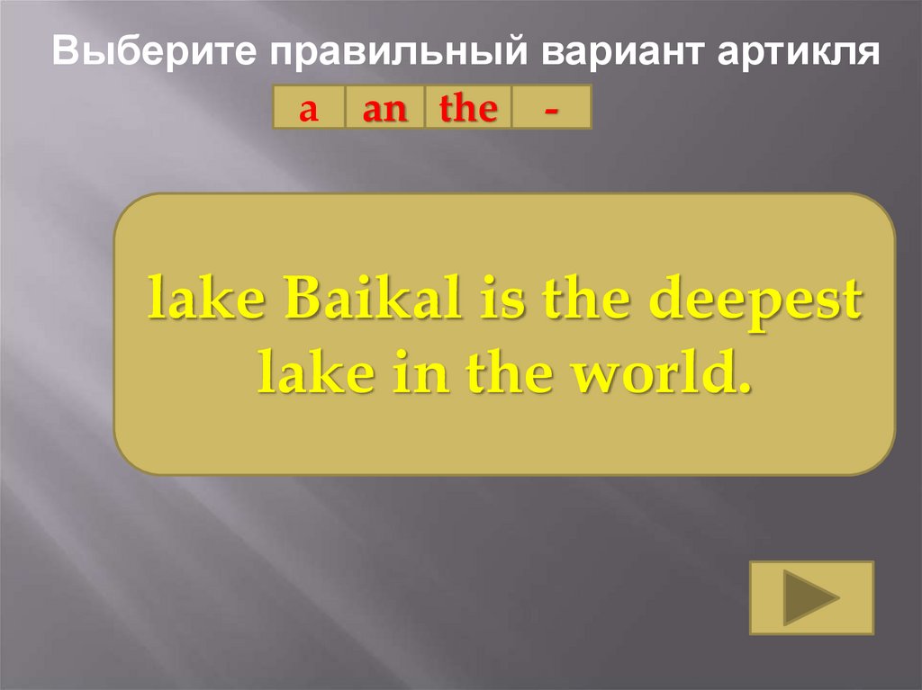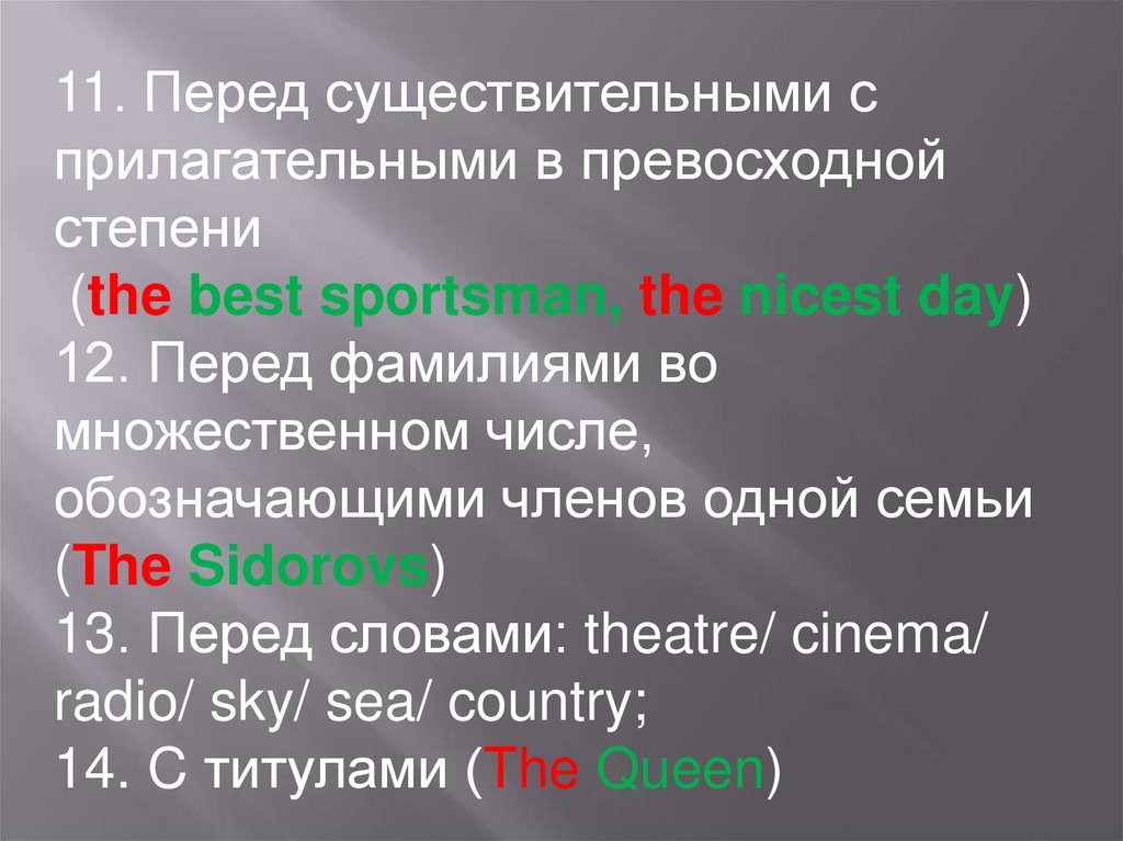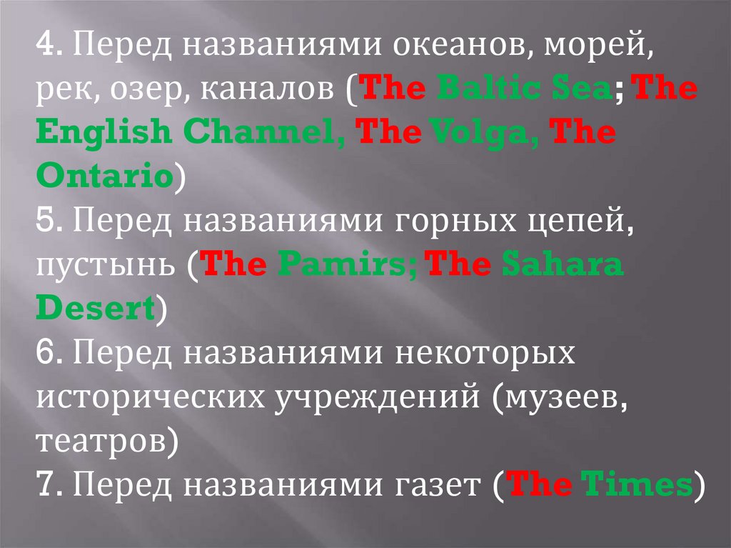 4. Перед названиями океанов, морей,рек, озер, каналов (The Baltic Sea; The