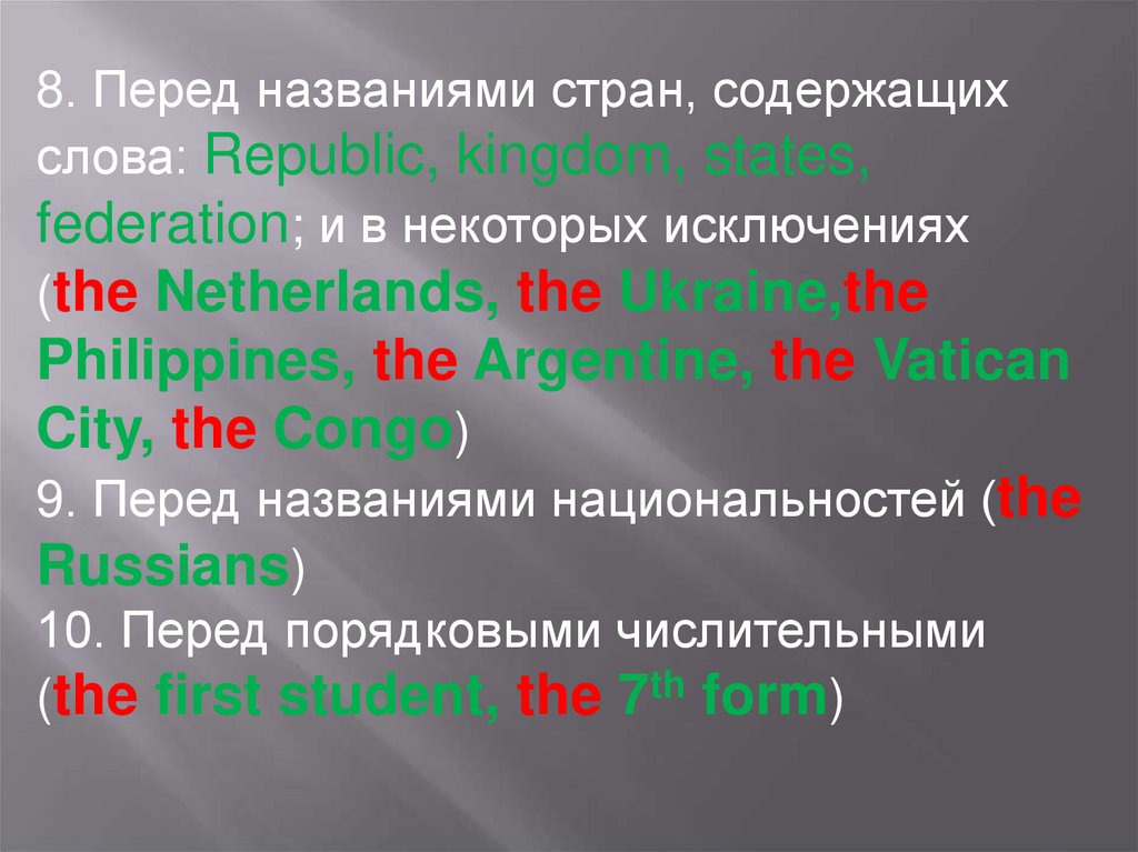 8. Перед названиями стран, содержащихслова: Republic, kingdom, states,