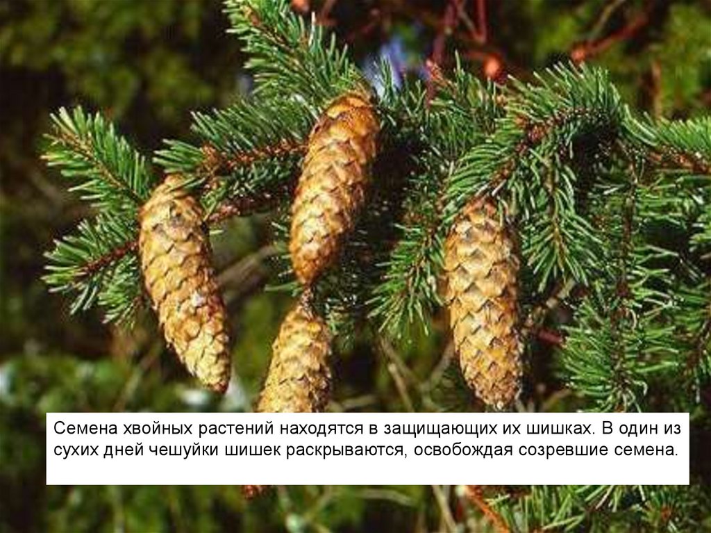 Семена хвойных растений находятся в защищающих их шишках. В один изсухих дней чешуйки шишек раскрываются, освобождая созревшие семена.
