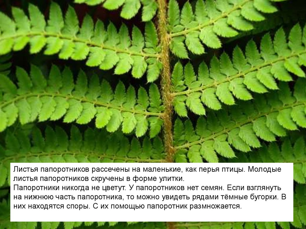 Листья папоротников рассечены на маленькие, как перья птицы. Молодыелистья папоротников скручены в форме улитки.