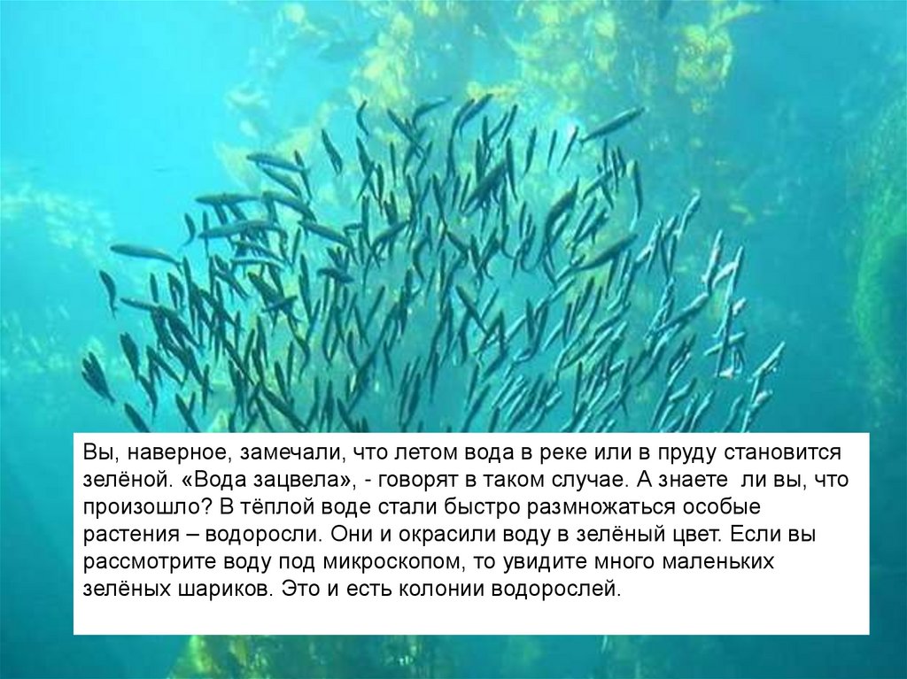Вы, наверное, замечали, что летом вода в реке или в пруду становитсязелёной. «Вода зацвела», - говорят в таком случае. А знаете ли вы, что