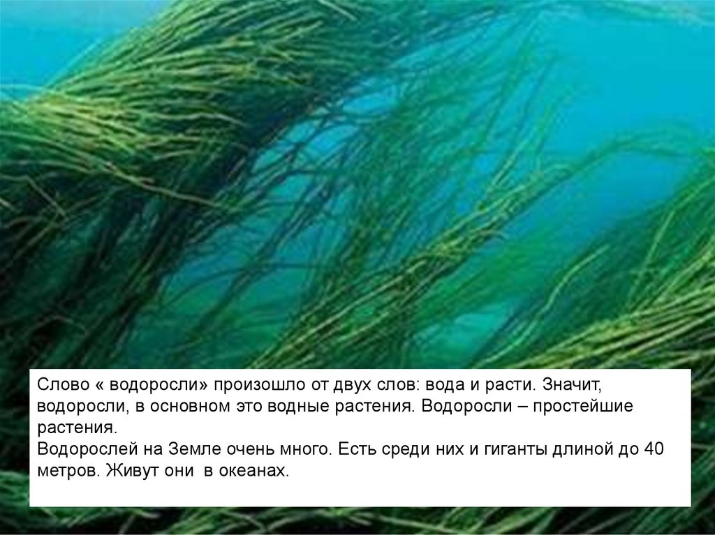 Слово « водоросли» произошло от двух слов: вода и расти. Значит,водоросли, в основном это водные растения. Водоросли – простейшие