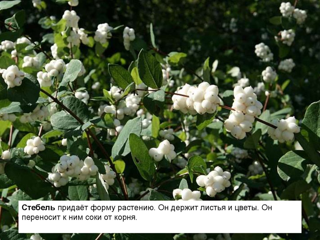 Стебель придаёт форму растению. Он держит листья и цветы. Онпереносит к ним соки от корня.