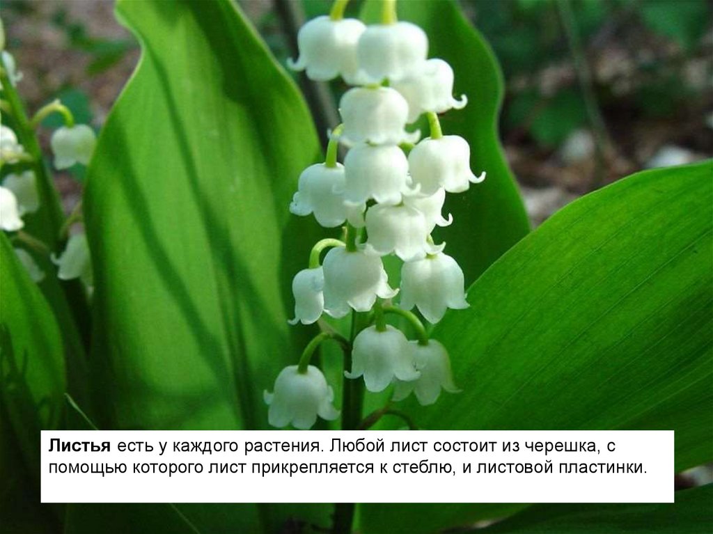 Листья есть у каждого растения. Любой лист состоит из черешка, спомощью которого лист прикрепляется к стеблю, и листовой пластинки.