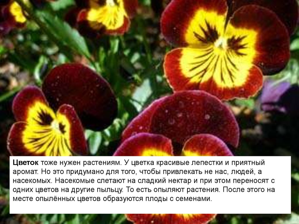 Цветок тоже нужен растениям. У цветка красивые лепестки и приятныйаромат. Но это придумано для того, чтобы привлекать не нас, людей, а