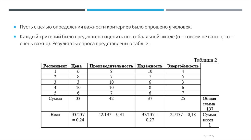 Пусть с целью определения важности критериев было опрошено 5 человек.Каждый критерий было предложено оценить по 10-балльной шкале (0 – совсем не важно, 10 –