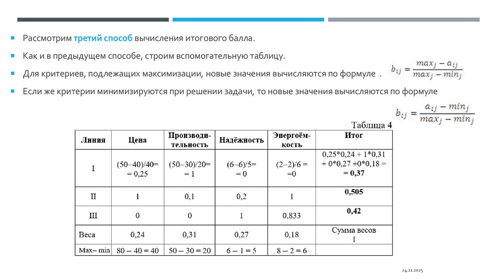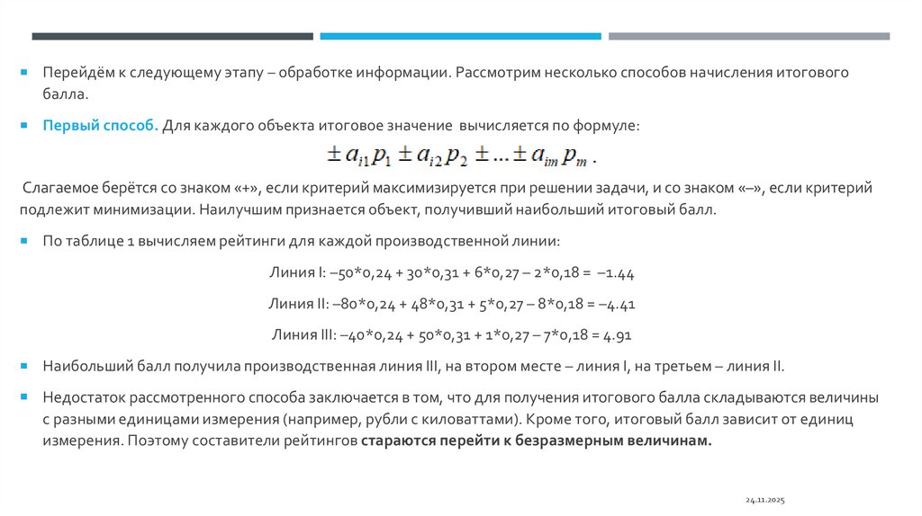 с разными единицами измерения (например, рубли с киловаттами). Кроме того, итоговый балл зависит от единиц