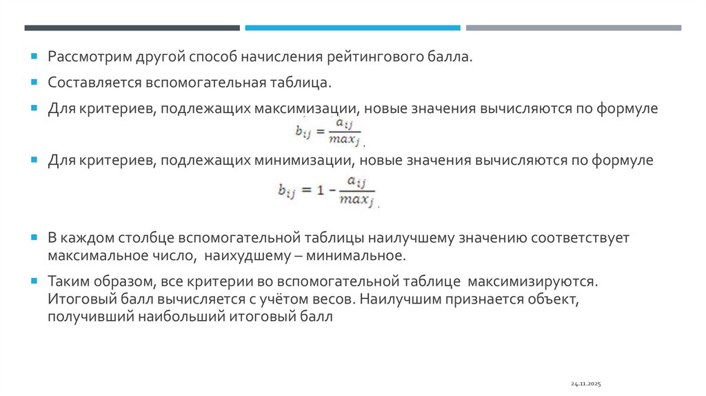 подлежит минимизации. Наилучшим признается объект, получивший наибольший итоговый балл.