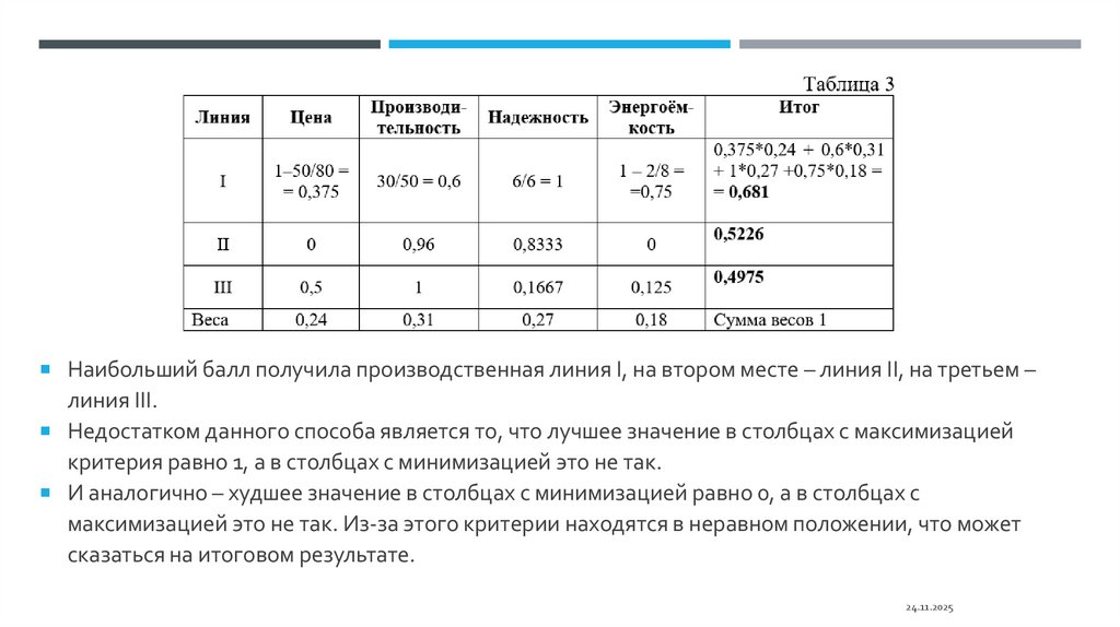 Наибольший балл получила производственная линия I, на втором месте – линия II, на третьем –линия III.