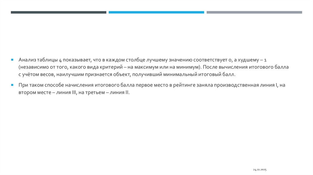 При таком способе начисления итогового балла первое место в рейтинге заняла производственная линия I, на