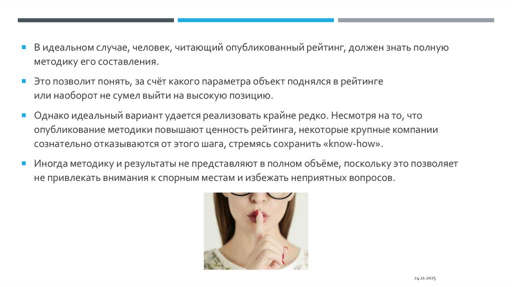 В идеальном случае, человек, читающий опубликованный рейтинг, должен знать полнуюметодику его составления.
