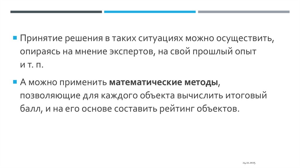 Принятие решения в таких ситуациях можно осуществить,опираясь на мнение экспертов, на свой прошлый опыт