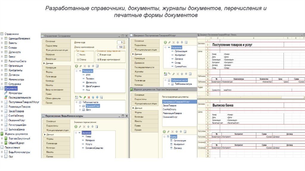 Разработанные справочники, документы, журналы документов, перечисления ипечатные формы документов