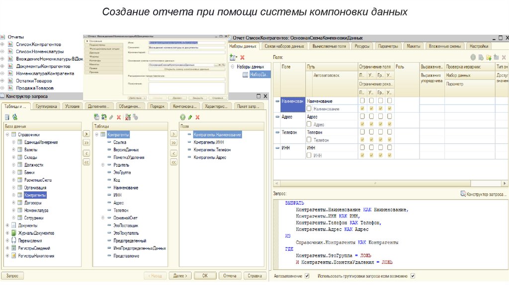 данные о контрагентах, товарах, услугах, номенклатурах и сотрудниках.
