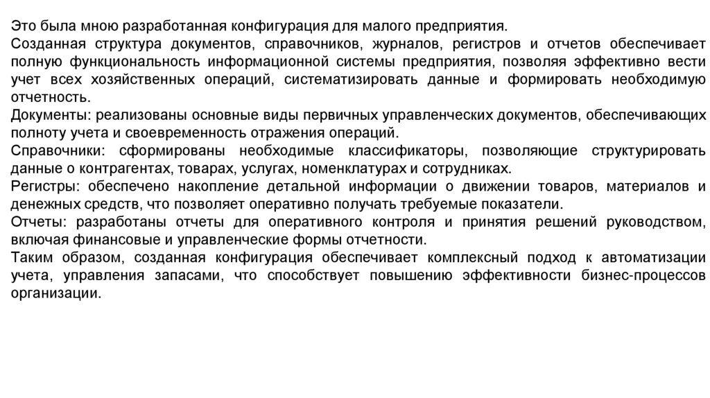 Это была мною разработанная конфигурация для малого предприятия.Созданная структура документов, справочников, журналов, регистров и отчетов обеспечивает