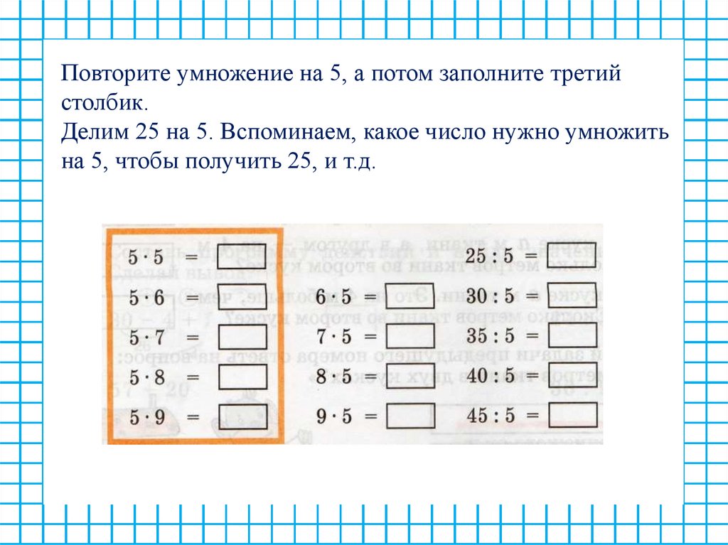 Делим 25 на 5. Вспоминаем, какое число нужно умножить