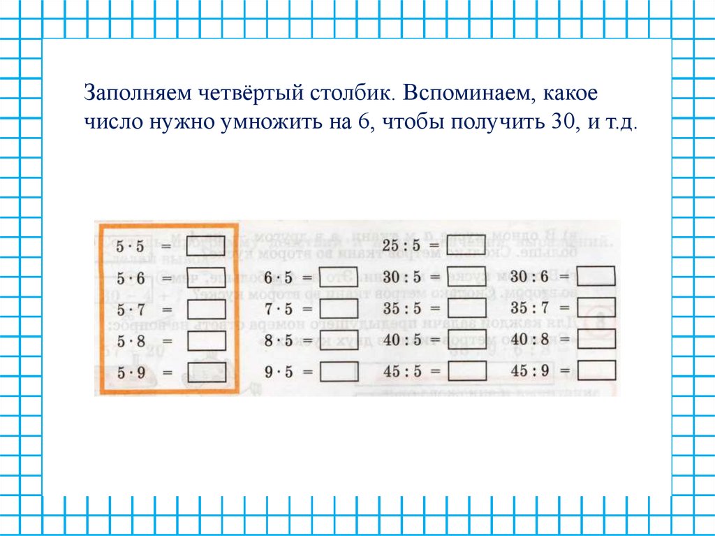 Заполняем четвёртый столбик. Вспоминаем, какоечисло нужно умножить на 6, чтобы получить 30, и т.д.