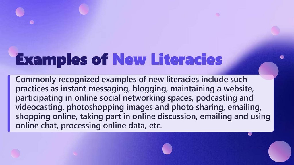 Examples of New LiteraciesCommonly recognized examples of new literacies include such