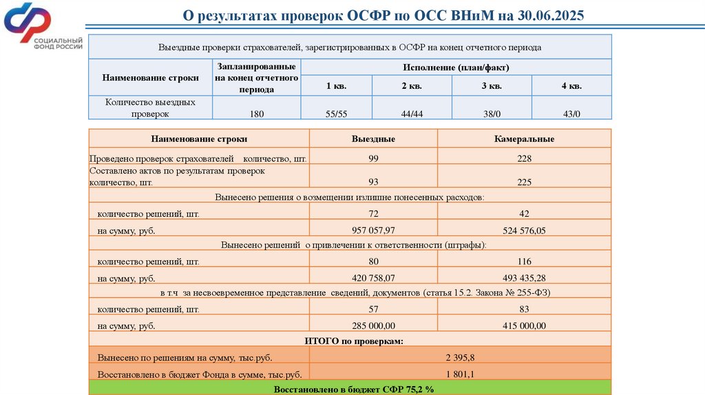 О результатах проверок ОСФР по ОСС ВНиМ на 30.06.2025Выездные проверки страхователей, зарегистрированных в ОСФР на конец отчетного периода