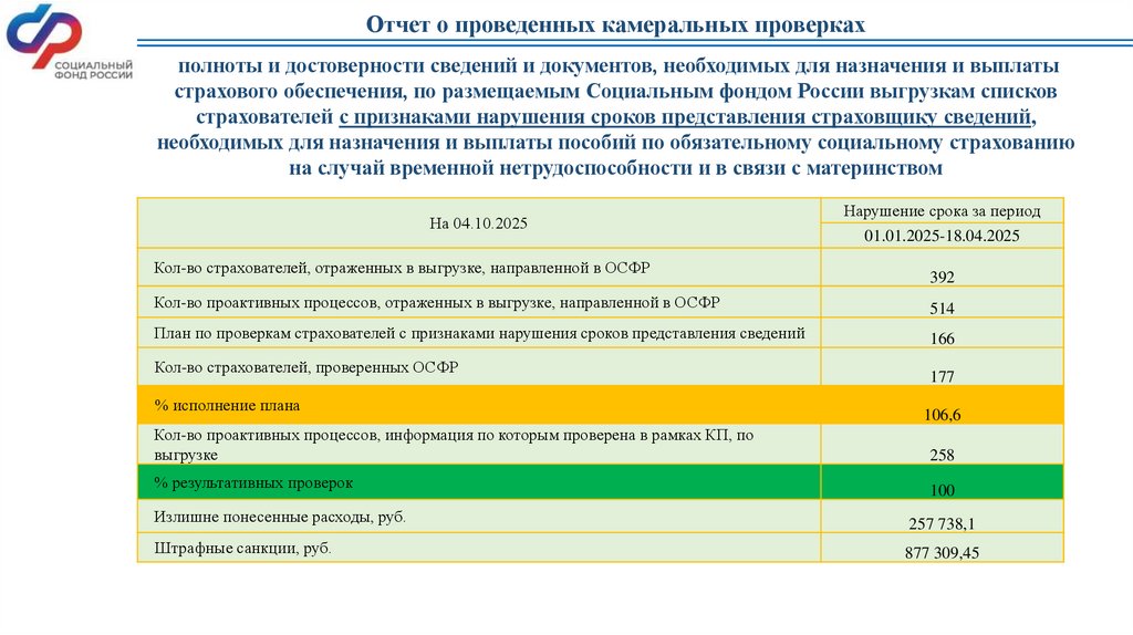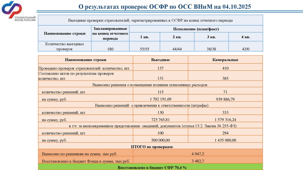 О результатах проверок ОСФР по ОСС ВНиМ на 04.10.2025Выездные проверки страхователей, зарегистрированных в ОСФР на конец отчетного периода