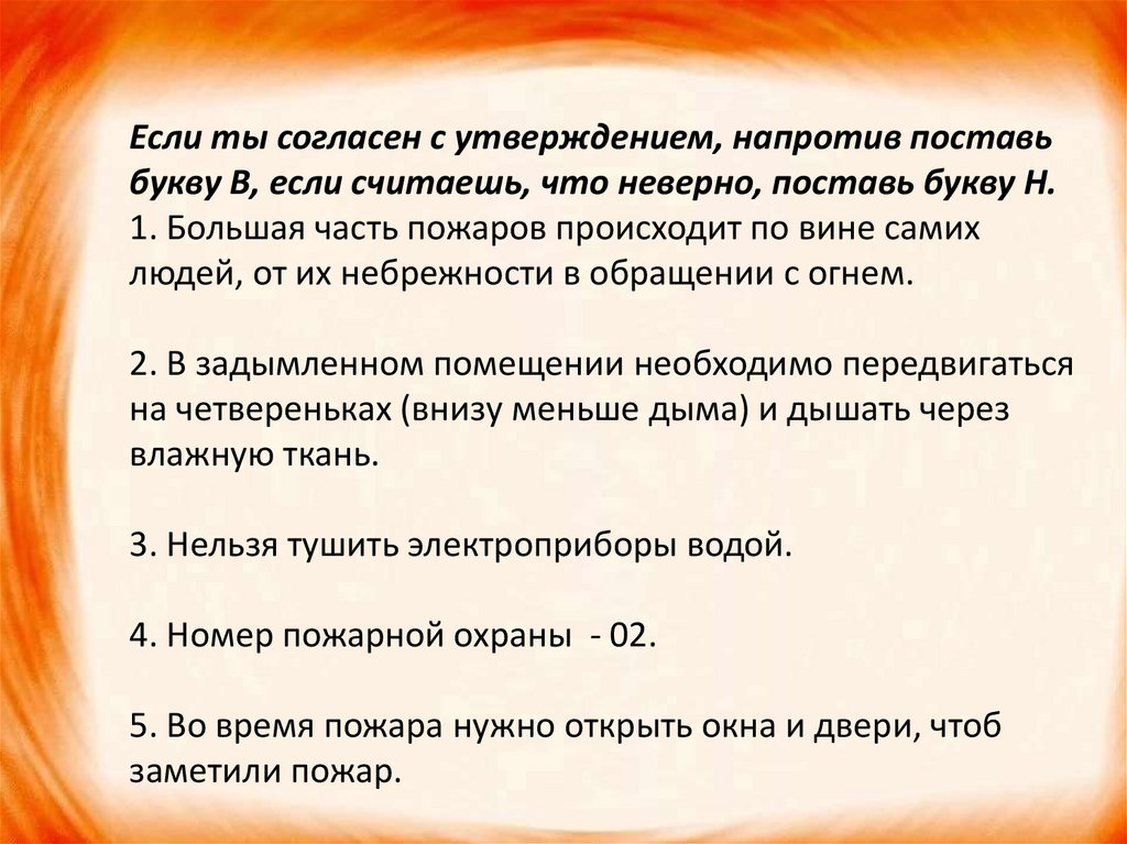 Если ты согласен с утверждением, напротив поставьбукву В, если считаешь, что неверно, поставь букву Н.