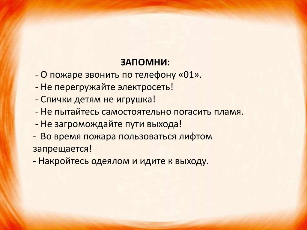 ЗАПОМНИ:- О пожаре звонить по телефону «01».