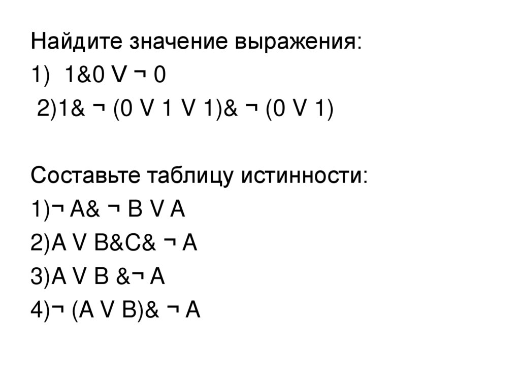 Найдите значение выражения:1) 1&0 V ¬ 0