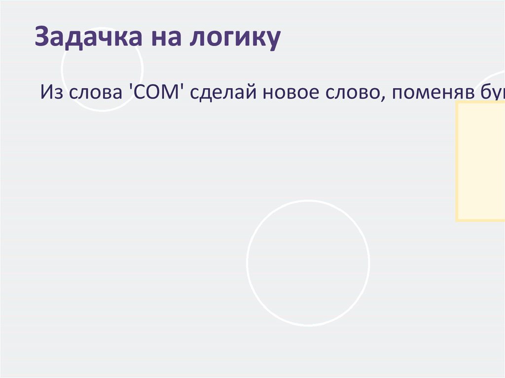 Задачка на логикуИз слова 'СОМ' сделай новое слово, поменяв бук