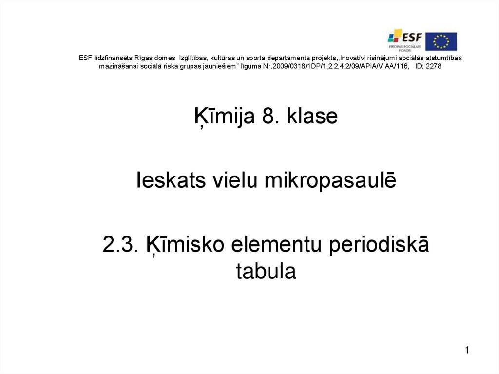 mazināšanai sociālā riska grupas jauniešiem” līguma Nr.2009/0318/1DP/1.2.2.4.2/09/APIA/VIAA/116, ID: 2278Ķīmija 8. klase
