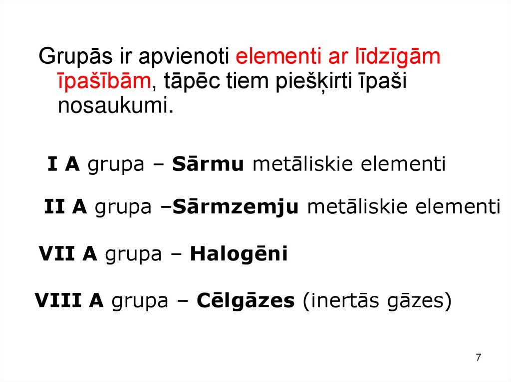 Grupās ir apvienoti elementi ar līdzīgāmīpašībām, tāpēc tiem piešķirti īpaši