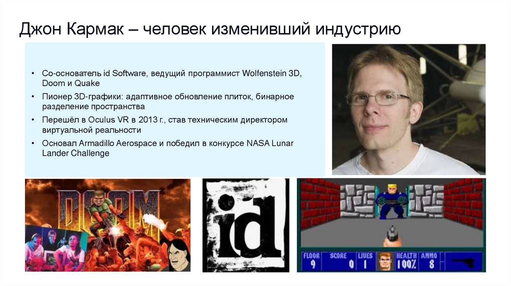 Джон Кармак – человек изменивший индустрию• Со-основатель id Software, ведущий программист Wolfenstein 3D,