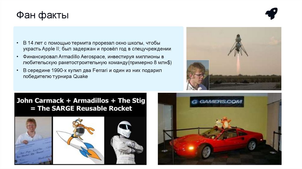 • Основал Armadillo Aerospace и победил в конкурсе NASA Lunar